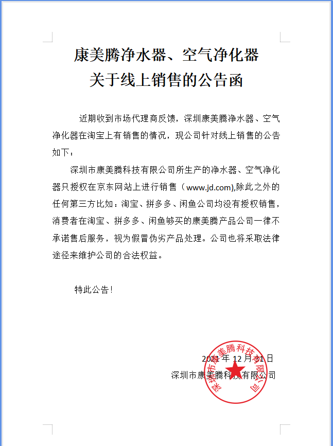 • 康美(měi)騰産品關于線上(shàng)銷售公告函